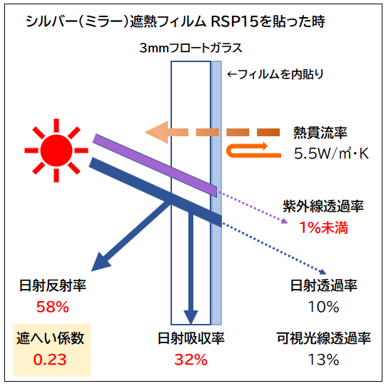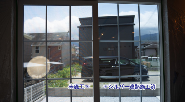室内側ガラスへの内貼りに、熱吸収を抑える高機能シルバーフィルムも、よく選択されます。