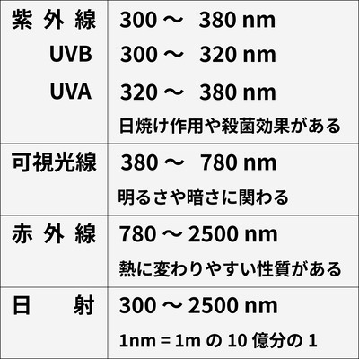 日射は、地球に到達する太陽光そのものになります。太陽光は波の性質があり、波の長さは300ナノメートルから2500ナノメートルです。波長によっていくつかに下表のように分類されます。