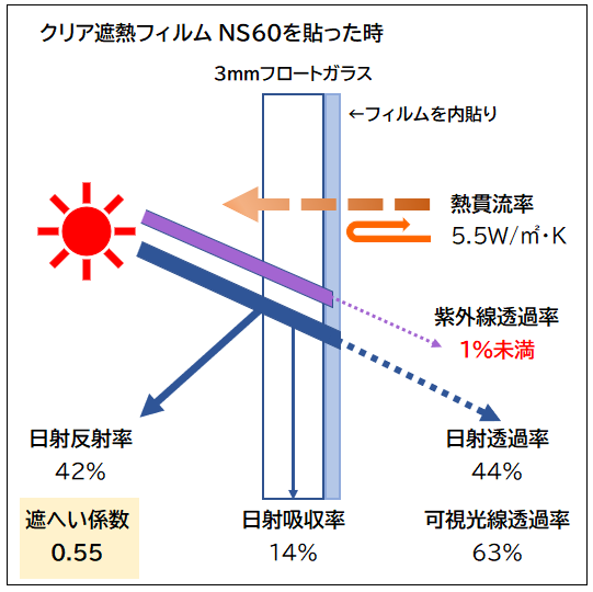 シルバータイプでもクリア(透明)タイプでも、熱吸収を抑えた高機能フィルムで、①紫外線カットと②飛散防止効果を得ることができます。
