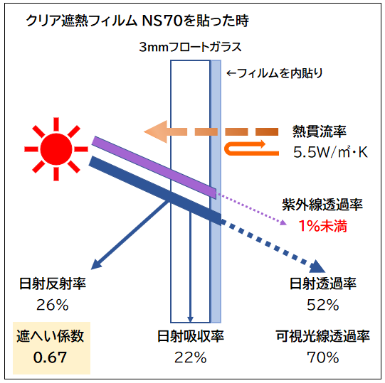 - 遮熱機能のない「飛散防止フィルム」の紫外線カットで対応する。