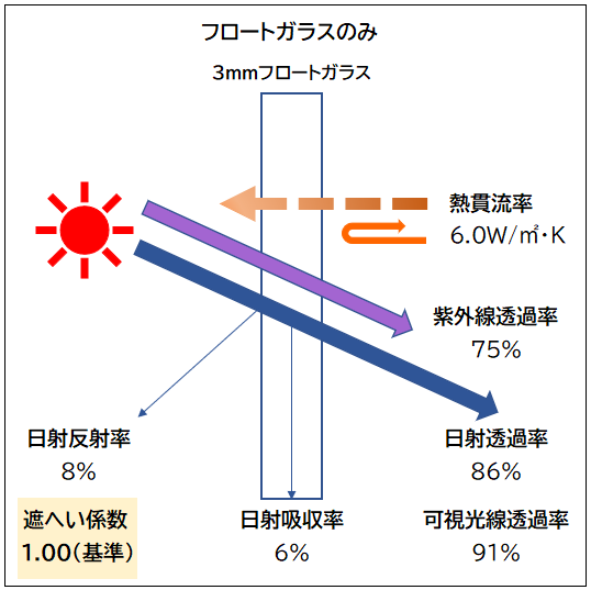 フロートガラスでは、日射の遮蔽効果がほぼない目安として、遮蔽係数を1.0と設定します。