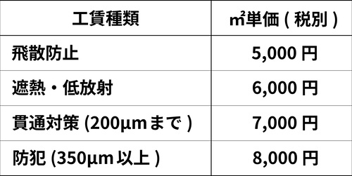 飛散防止、遮熱、防犯の各用途の工賃一覧です。(※フィルム代・運搬費は別途。)